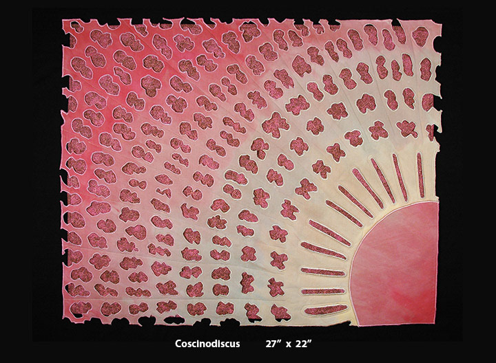 This series is based on diatom surface patterns seen with a scanning electron microscope. Several layers of fabric were used; openings in the top layers reveal textured layers below.