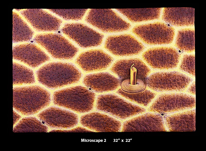 Microscape and Microscape 2 are based on scanning electron microscope images of the microscopic patterns on the surface of amphipods. Amphipods are tiny shrimp like creatures that swim in the water, burrow in mud or live on the beach. "Sand Fleas" are a type of amphipod that is sometimes seen jumping on beaches at low tide.