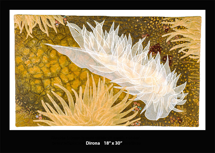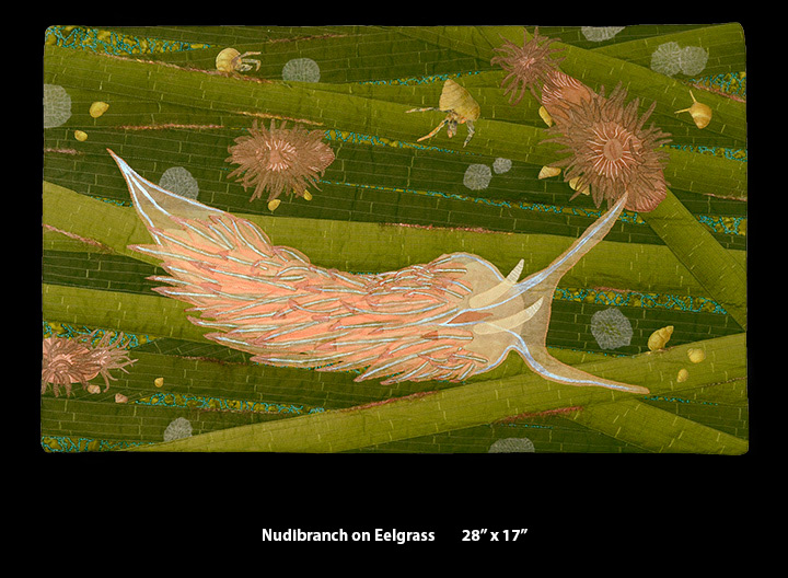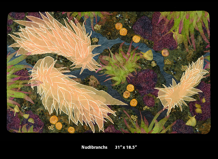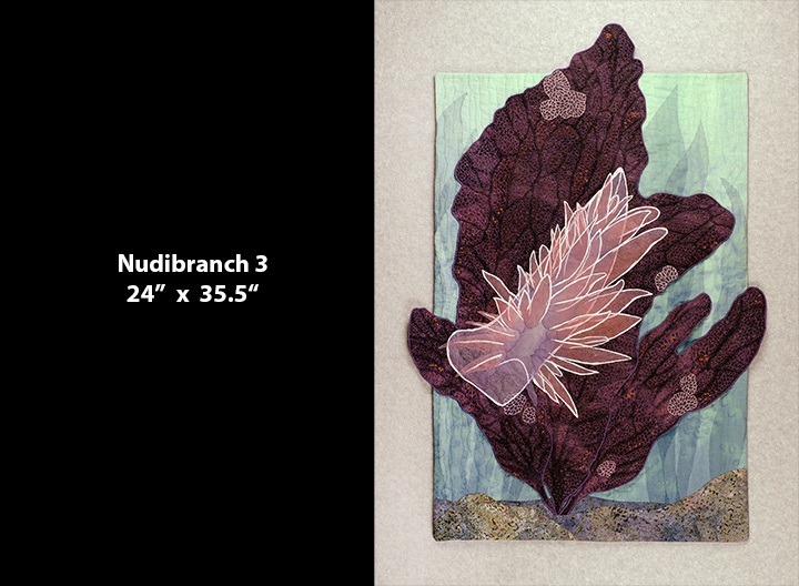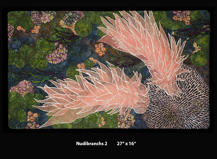 Nudibranchs are sea snails without shells. They often have colorful "naked gills" projecting from their backs. These pieces were made with cotton fabric, hand painted silk organza, silk ribbon, free motion machine stitching and hand embroidery.