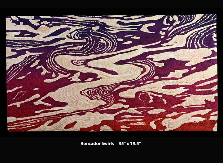 Patterns on the surface of water. Cotton fabric, soy wax resist, hand dyed fabric, free motion stitching, hand seed stitching, paint.